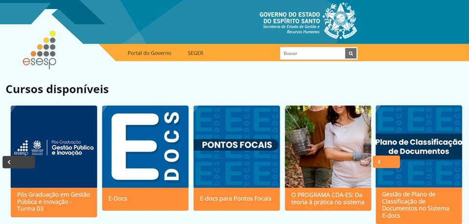 Servidores públicos estaduais e municipais já podem se inscrever nos cursos “E-Docs”, “E-Docs para Pontos Focais” e “Gestão do Plano de Classificação de Documentos no Sistema E-Docs”, oferecidos pela Escola de Serviço Público do Espírito Santo (Esesp) na modalidade de Educação a Distância (EAD).