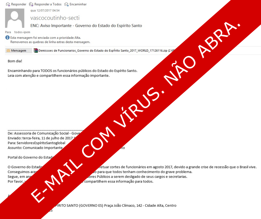 A mensagem carrega anexado um arquivo que contém vírus. Se aberto, poderá infectar o computador e a rede do usuário.