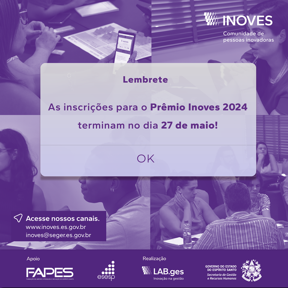 O prazo para inscrições no Prêmio Inoves 2024 está próximo de encerrar. Os servidores públicos interessados em participar desta edição devem verificar o regulamento e efetuar o cadastro até a próxima segunda-feira (27), pelo site www.inoves.es.gov.br.