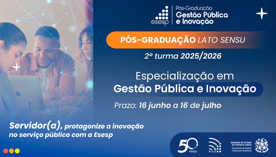 A Escola de Serviço Público do Espírito Santo (Esesp) abriu as inscrições para a segunda turma da pós-graduação em Gestão Pública e Inovação, voltada a servidores públicos estaduais e municipais com vínculo efetivo. Com duração de 18 meses e aulas presenciais, o curso será realizado na sede da Esesp, em Vitória, e oferece formação gratuita, especializada e voltada aos desafios da administração pública contemporânea.