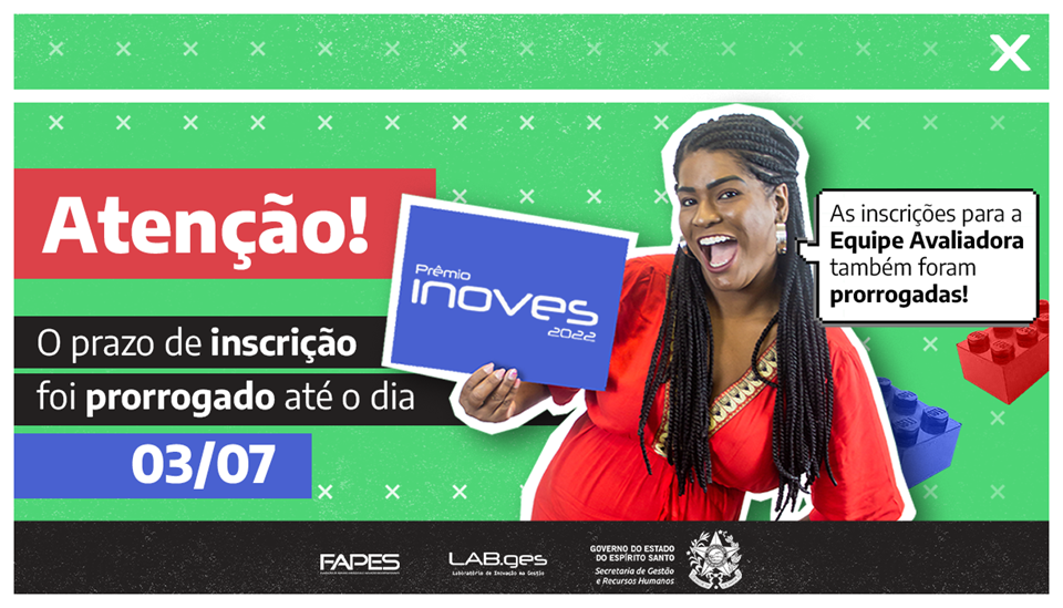 Os interessados em concorrer ao Prêmio Inoves ganharam mais uma semana para inscreverem seus projetos. O prazo de inscrição foi prorrogado para o dia 03 de julho. Para participar, acesse o site www.inoves.es.gov.br. O Prêmio tem foco nos profissionais do Executivo Estadual, municipal e de outros Poderes. Os trabalhos podem ser inscritos em uma das três categorias do programa, que são "Ideia", "Projeto em Desenvolvimento" e "Projeto de Resultados".