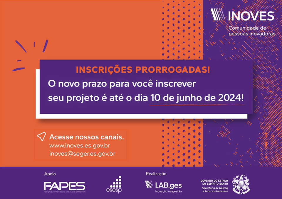 Os servidores públicos interessados em concorrer ao Prêmio Inoves 2024 ganharam mais dias para cadastrarem seus projetos. O prazo de inscrições foi prorrogado para o próximo dia 10 de junho. Para participar, basta verificar o regulamento e efetuar a inscrição pelo site www.inoves.es.gov.br.
