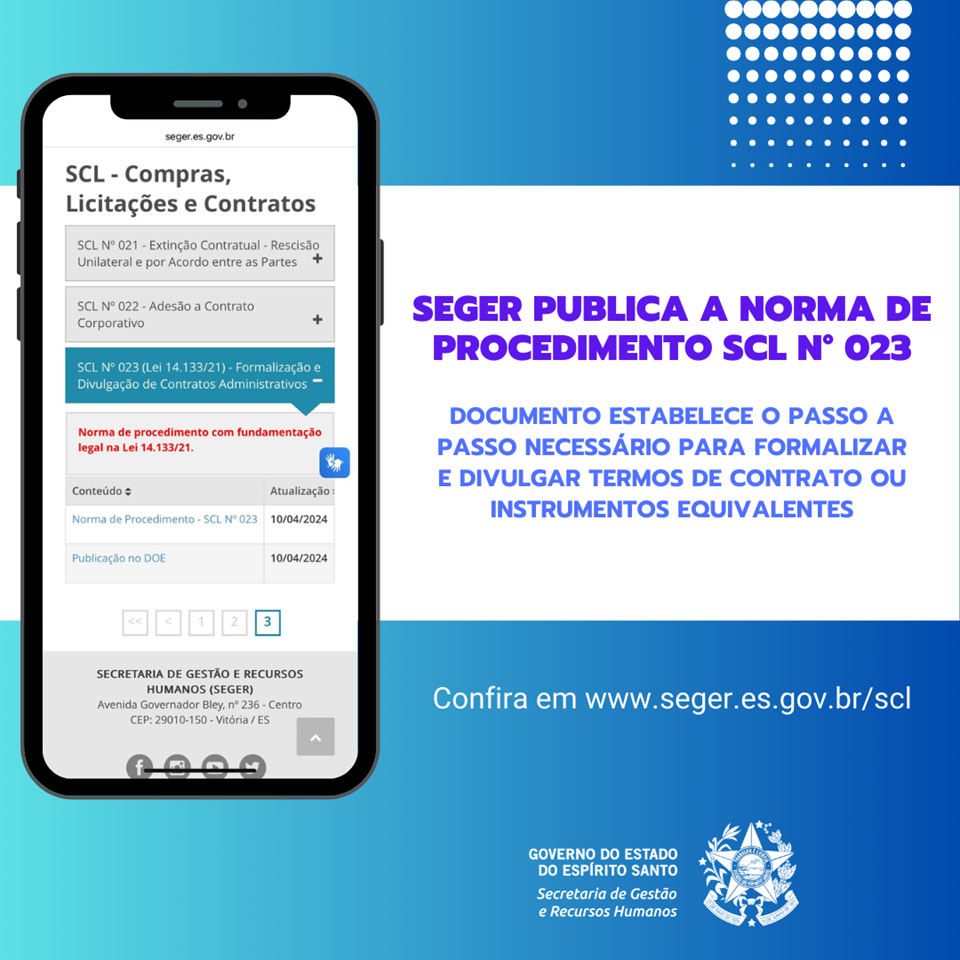A Secretaria de Gestão e Recursos Humanos (Seger) publicou, no Diário Oficial do Estado desta quarta-feira (10), a Portaria N° 23-R, que aprova a norma de procedimento SCL N° 023 sobre a formalização e a divulgação de contratos administrativos.